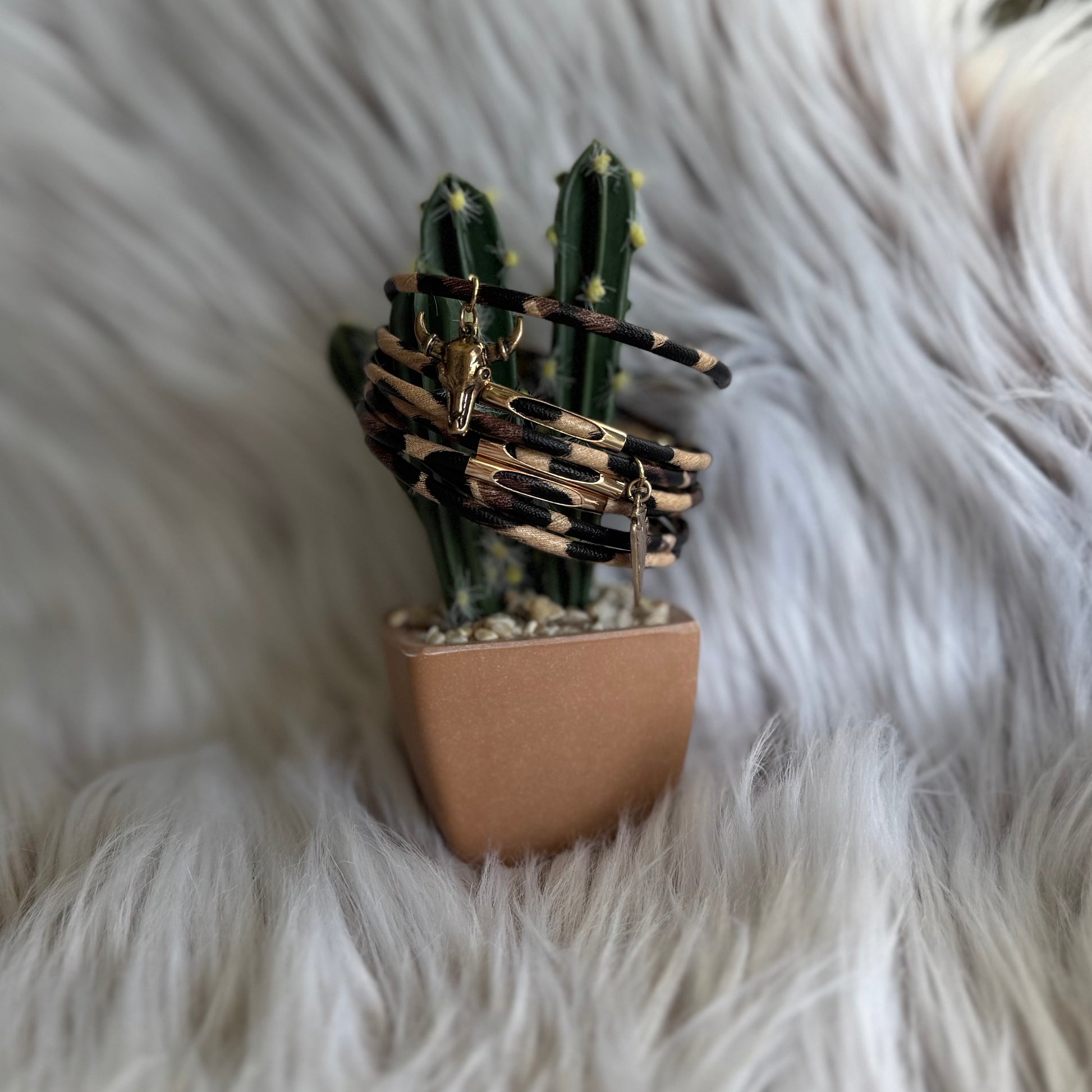 For the wild hearts and whiskey souls—The Rowdy Stampede Wrap Bracelet brings that untamed spirit straight to your wrist. With layered faux leather bands in a bold western print and edgy metal charms (hello, bull skull & arrowhead!), this piece is made for the ones who know how to make an entrance.